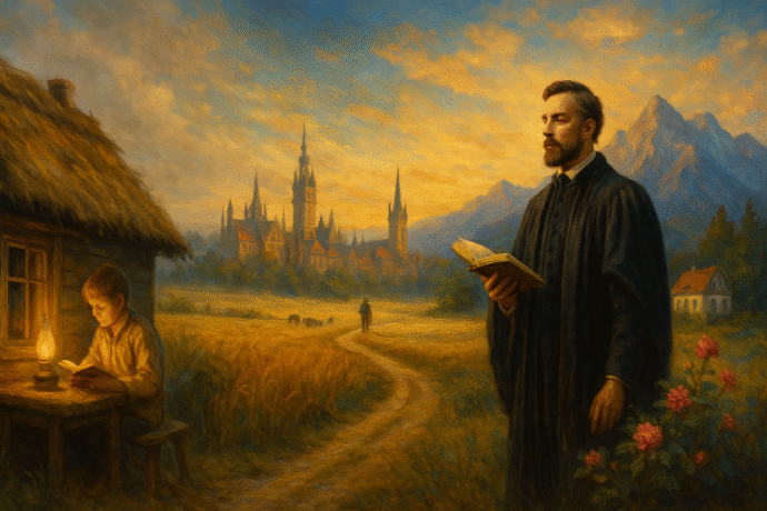 Jan Kasprowicz przyszedł na świat 12 grudnia 1860 r. we wsi Szymborze pod Inowrocławiem jako najstarszy z czternaściorga dzieci Piotra i Józefy z Kloftów. Rodzice nie umieli czytać ani pisać, ale matka potrafiła zarazić syna szacunkiem dla słowa i muzyki- wieczorami kazała mu „nasłuchiwać fujarki”, a w niedzielę prowadziła do kościoła, gdzie dźwięk organów miał – jak później wspominał poeta – „rozstrzęsć duszę”. Ta wczesna wrażliwość wyrastała z gleby Kujaw- dym torfowy, zapach wilgotnych pól i pogłos tańczonego po sąsiedzku kujawiaka wracały potem w jego wersach, łącząc religijny ton z pulsowaniem chłopskiej codzienności.